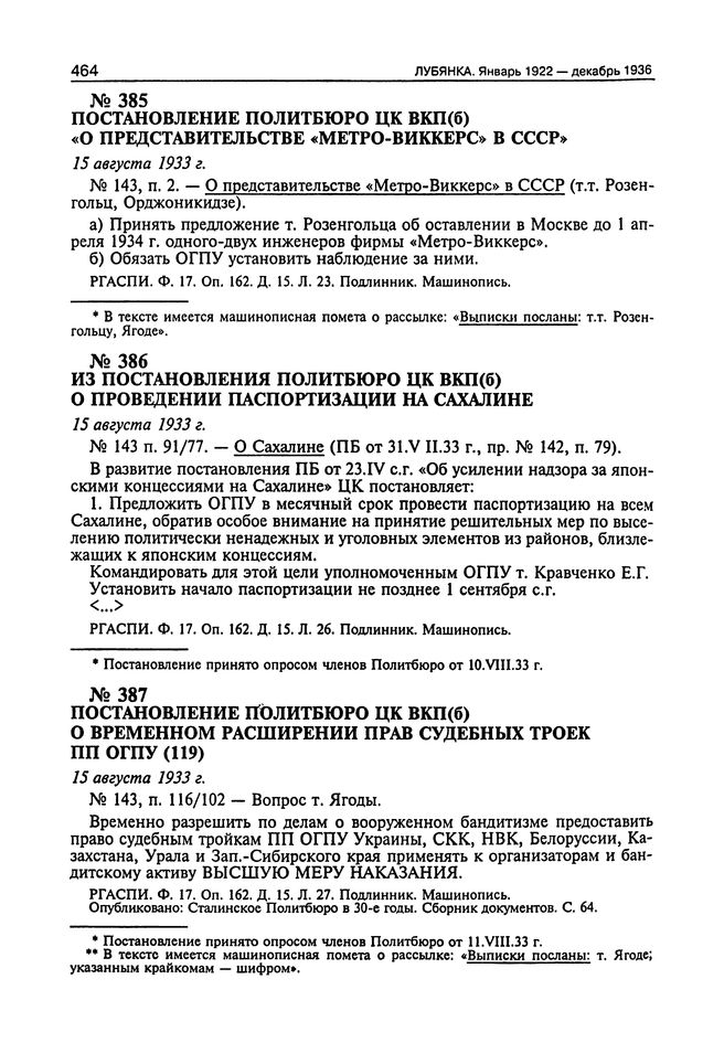 Постановление Политбюро ЦК ВКП(б) о временном расширении прав судебных троек ПП ОГПУ. 15 Августа 1933 г. // РГАСПИ. Ф. 17. Оп. 162. Д. 15. Л. 27. Подлинник. Машинопись. Опубликовано: Сталинское Политбюро в 30-е годы. Сборник документов. С. 64.