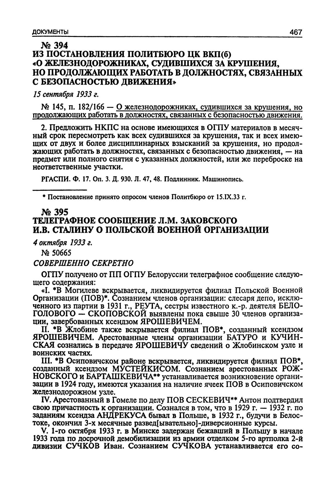 Телеграфное сообщение Л.М. Заковского И.В. Сталину о польской военной организации. 4 Октября 1933 г. // АПРФ. Ф. 3. Оп. 58. Д. 243. Л. 86-88. Подлинник. Машинопись.