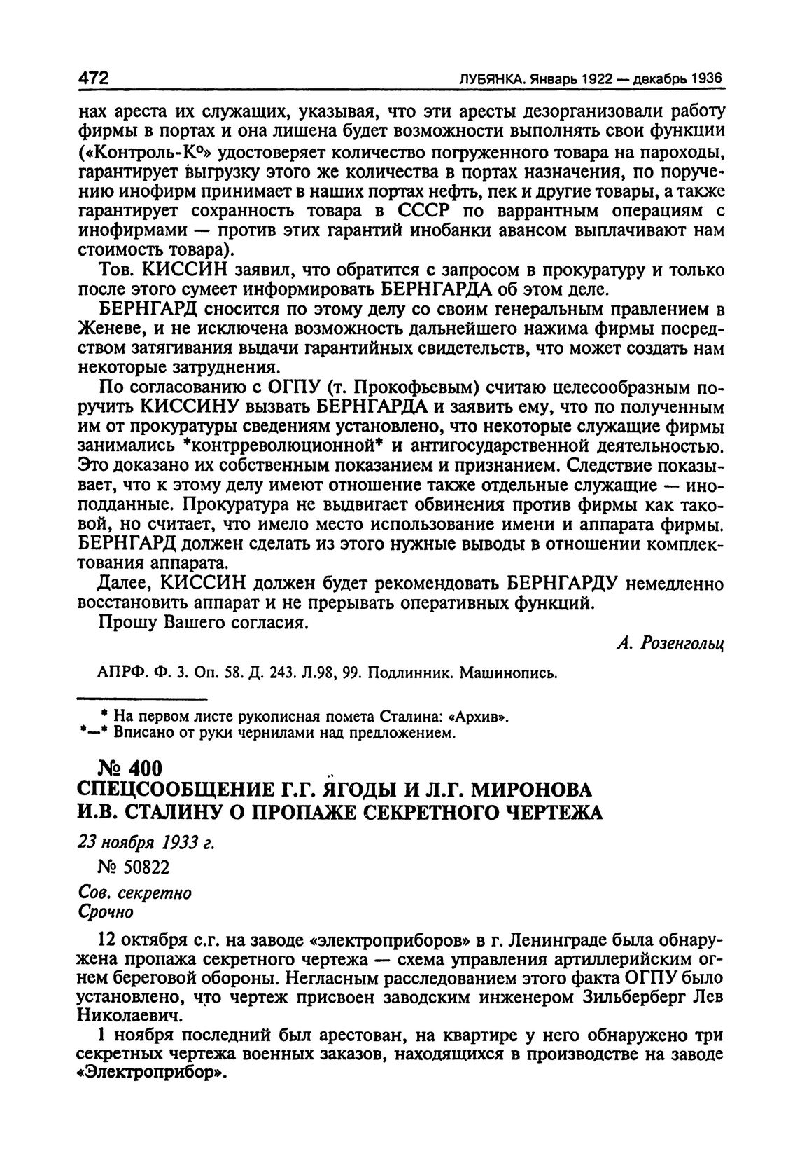 Спецсообщение Г.Г. Ягоды и Л.Г. Миронова И.В. Сталину о пропаже секретного чертежа. 23 Ноября 1933 г. // АПРФ. Ф. 3. Оп. 58. Д. 243. Л. 201, 202. Подлинник. Машинопись.