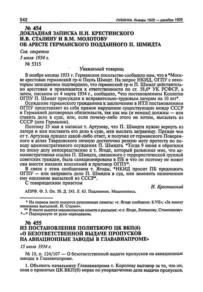 Докладная записка Н.Н. Крестинского И.В. Сталину и В.М. Молотову об аресте германского подданного П. Шмидта. 3 Июля 1934 г. // АПРФ. Ф. 3. Оп. 58. Д. 245. Л. 63. Подлинник. Машинопись.