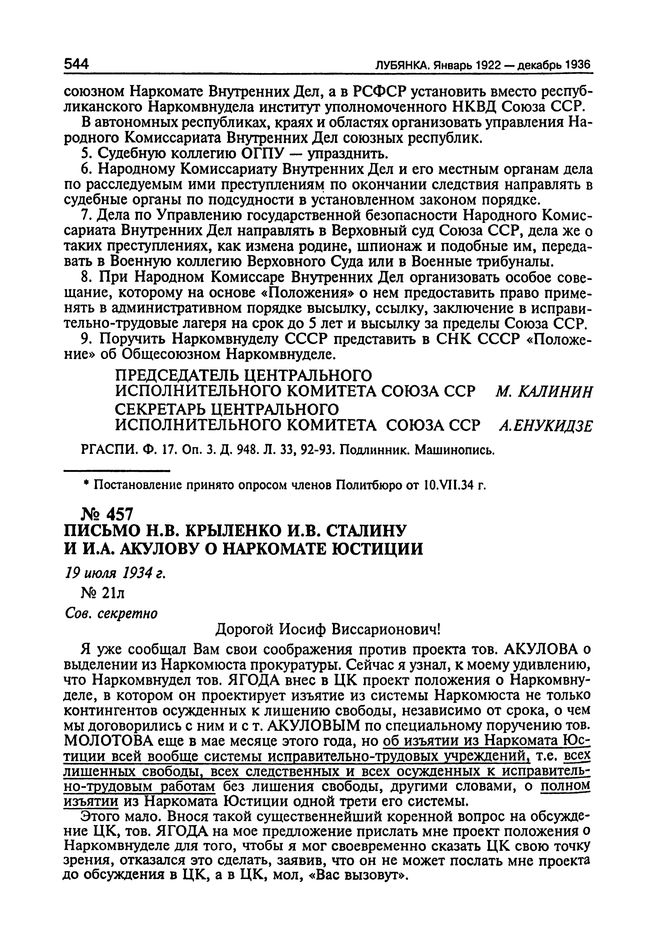 Письмо Н.В. Крыленко И.В. Сталину и И.А. Акулову о Наркомате юстиции. 19 Июля 1934 г.