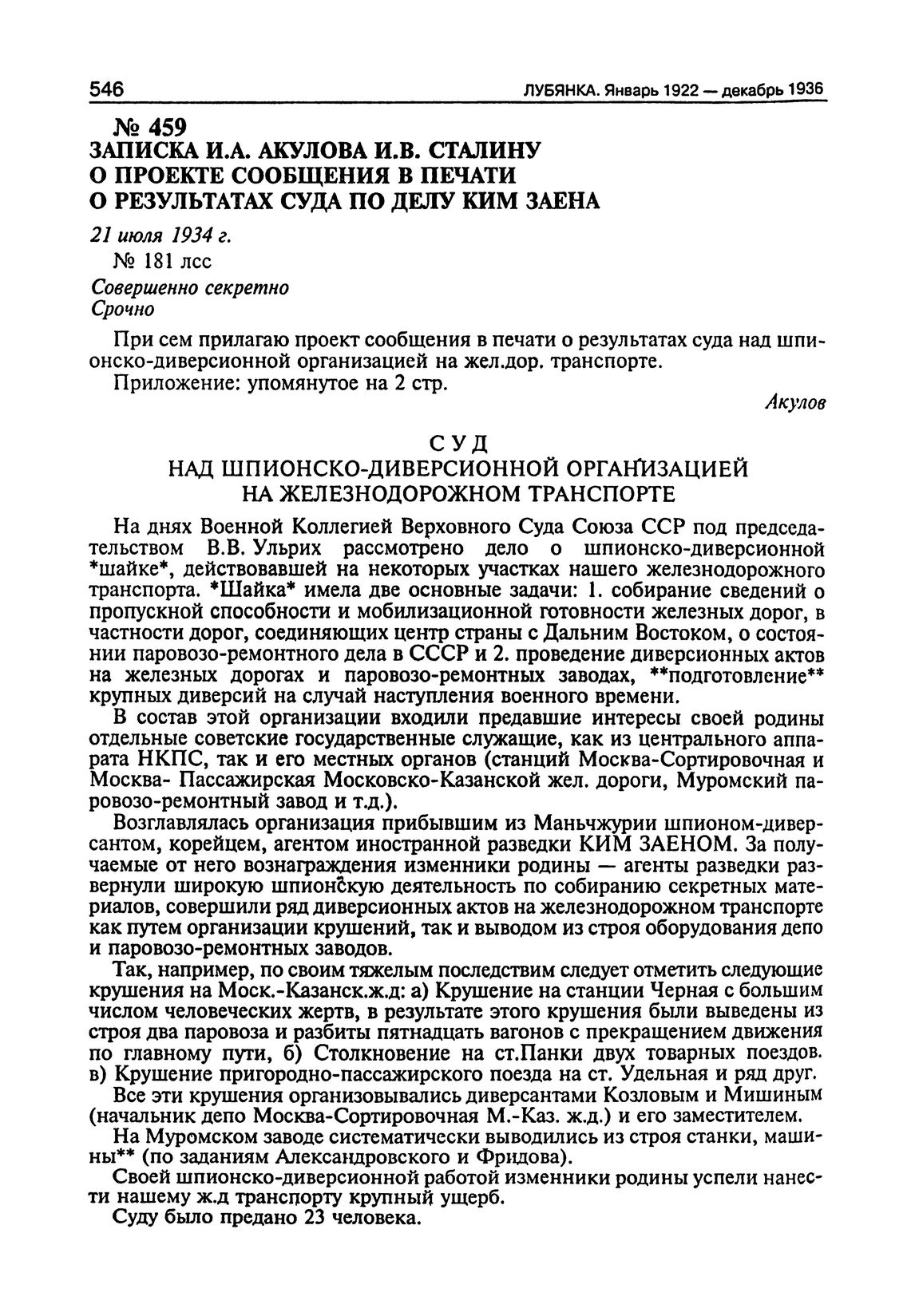 Записка И.А. Акулова И.В. Сталину о проекте сообщения в печати о результатах суда по делу Ким Заена. 21 Июля 1934 г. // АПРФ. Ф. 3. Оп. 58. Д. 245. Л.93-95. Подлинник. Машинопись.