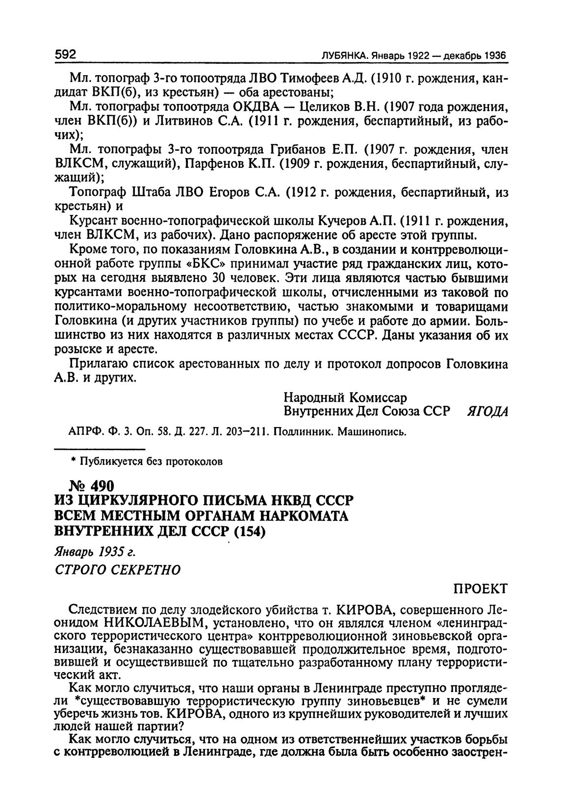 Из циркулярного письма НКВД СССР всем местным органам Наркомата Внутренних Дел СССР. Январь 1935 г. // ЦА ФСБ РФ. Ф. 3. Оп. 2. Д.7. Л. 1-2. Подлиник. Машинопись.