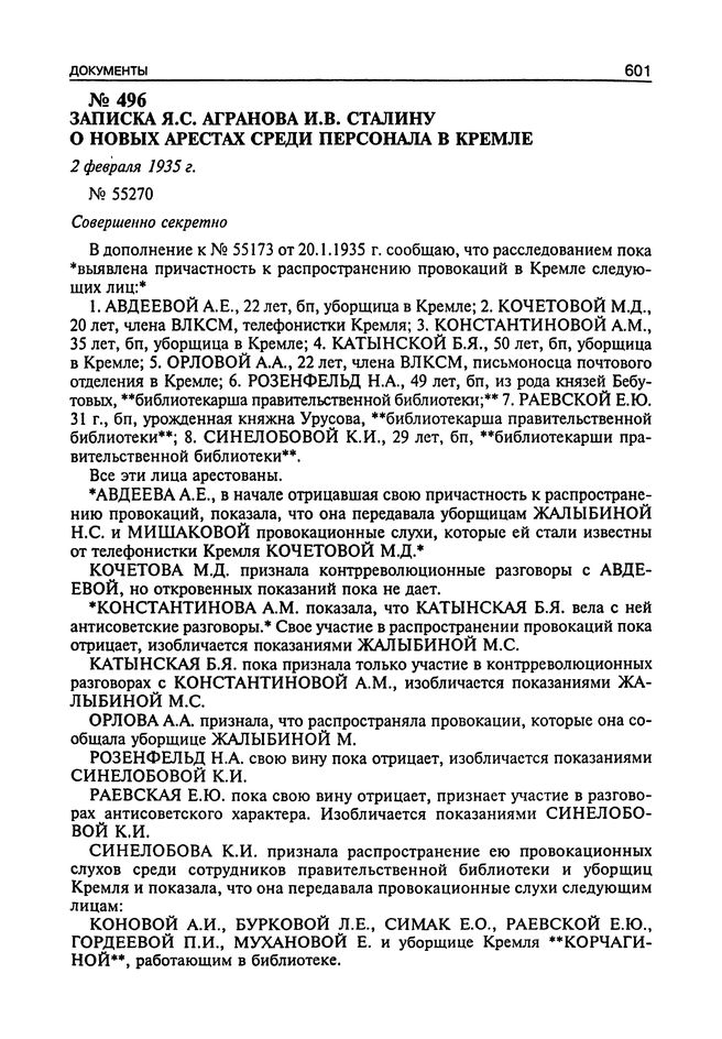 Записка Я.С. Агранова И.В. Сталину о новых арестах среди персонала в Кремле. 2 Февраля 1935 г. // АПРФ. Ф. 3. Оп. 58. Д. 231. Л. 15-17. Подлинник. Машинопись.