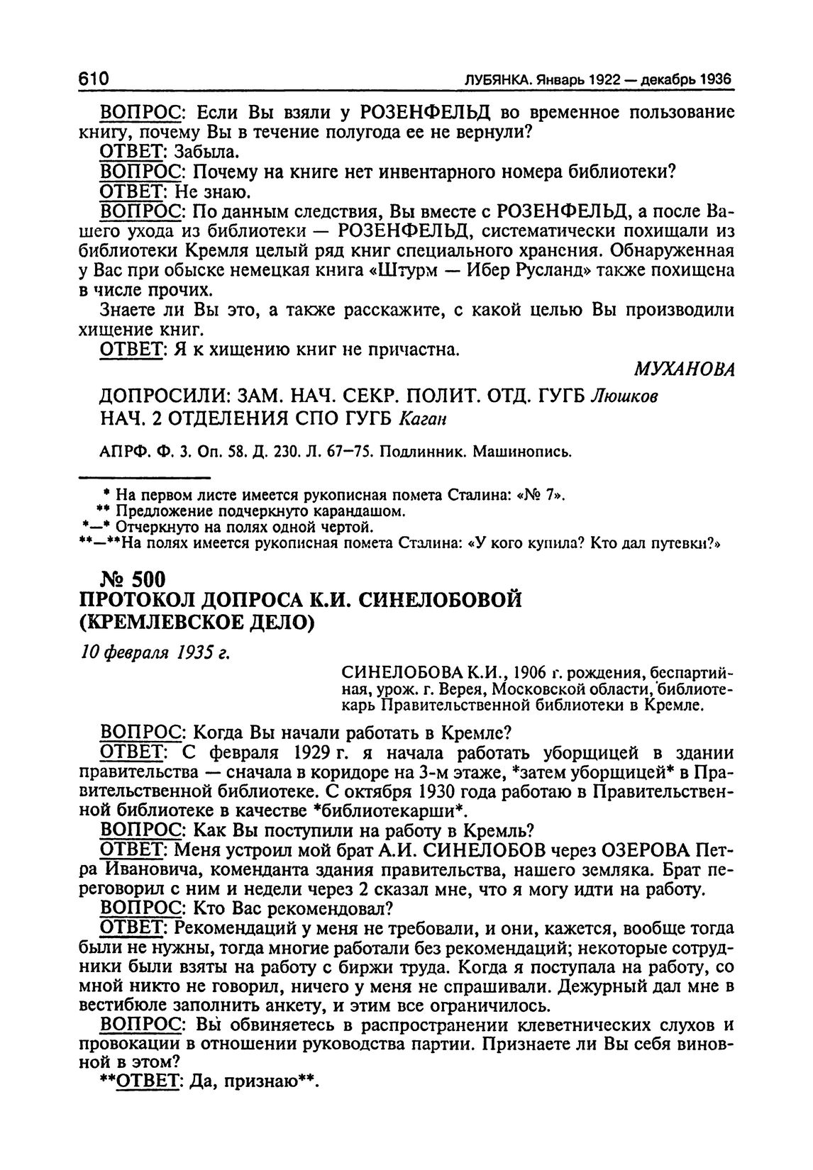 Протокол допроса К.И. Синелобовой (Кремлевское дело). 10 Февраля 1935 г.