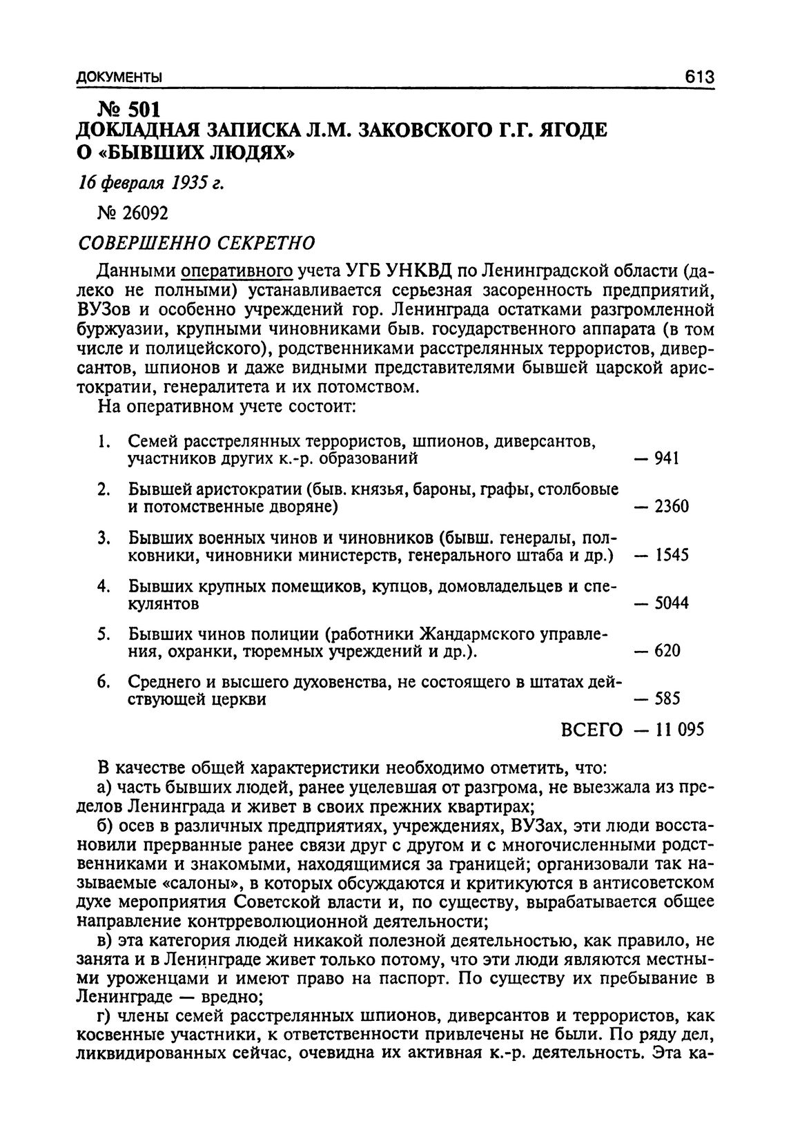 Докладная записка Л.М. Заковского Г.Г. Ягоде о «бывших людях». 16 Февраля 1935 г.