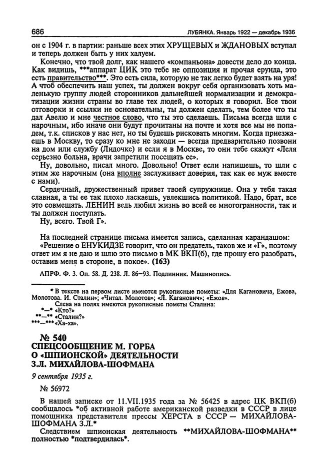 Спецсообщение М. Горба о «шпионской» деятельности З.Л. Михайлова-Шофмана. 9 Сентября 1935 г. // АПРФ. Ф. 3. Оп. 58. Д. 247. Л. 165, 166. Подлинник. Машинопись.