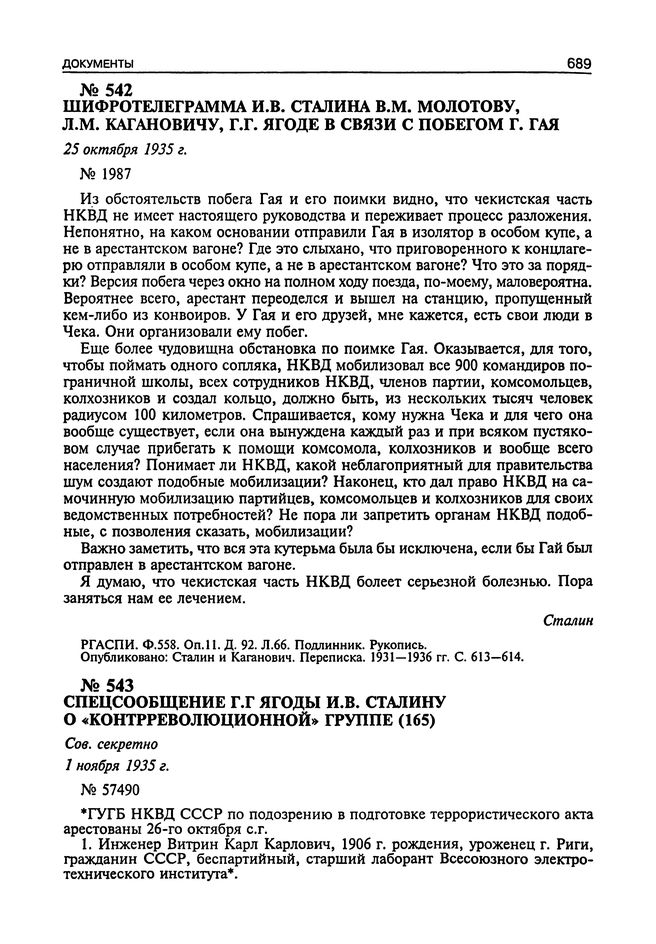 Шифротелеграмма И.В. Сталина В.М. Молотову, Л.М. Кагановичу, Г.Г. Ягоде в связи с побегом Г. Гая. 25 Октября 1935 г. // РГАСПИ. Ф. 558. Оп. 11. Д. 92. Л. 66. Подлинник. Рукопись. Опубликовано: Сталин и Каганович. Переписка. 1931- 1936 гг. С. 613—614.