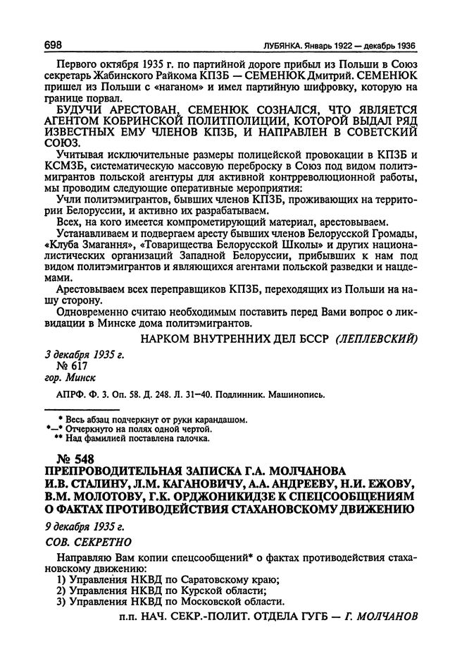 Препроводительная записка Г.А. Молчанова И.В. Сталину, Л.М. Кагановичу, А.А. Андрееву, Н.И. Ежову, В.М. Молотову, Г.К. Орджоникидзе к спецсообщениям о фактах противодействия стахановскому движению. 9 Декабря 1935 г. // ЦА ФСБ РФ. Ф. 3. Оп. 2. Д. 121. Л. 120-132. Копия. Машинопись.