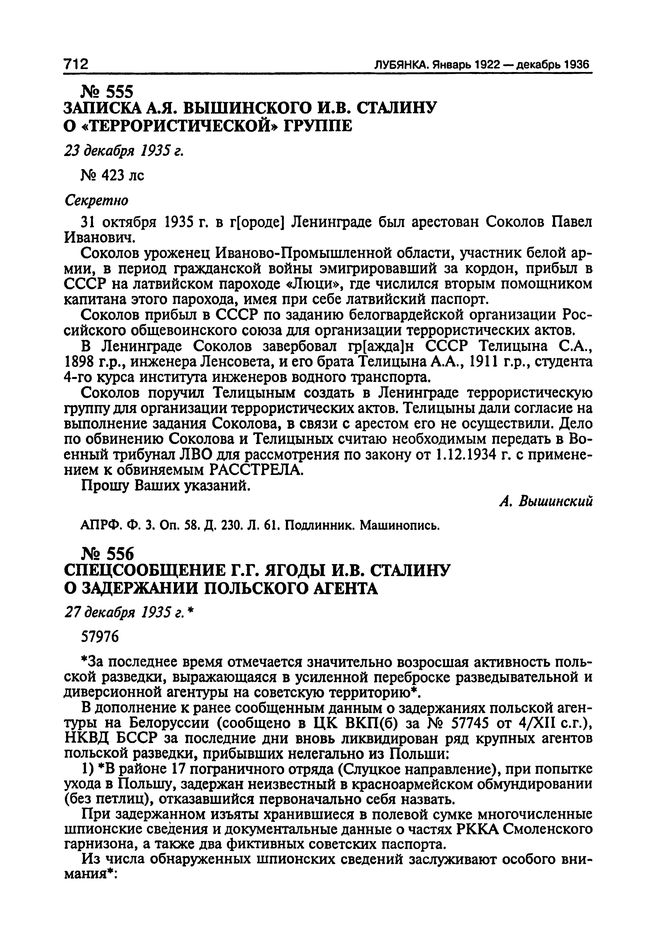 Лубянка. Сталин и ВЧК-ГПУ-ОГПУ-НКВД. Архив Сталина. Документы высших органов партийной и государственной власти. Январь 1922—декабрь 1936. — М.: МФД, 2003.