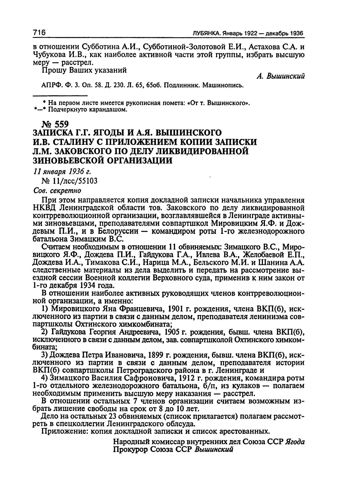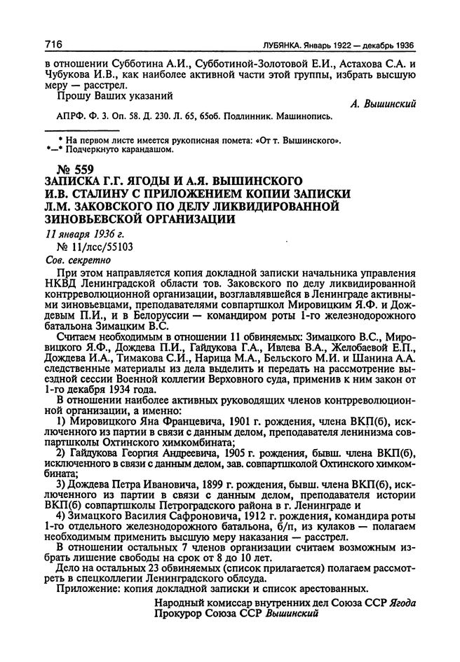 Записка Г.Г. Ягоды и А.Я. Вышинского И.В. Сталину с приложением копии записки Л.М. Заковского по делу ликвидированной зиновьевской организации. 11 Января 1936 г.