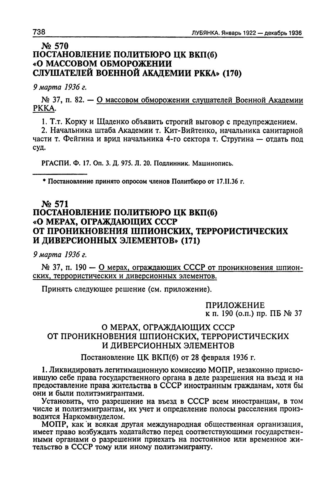 Постановление Политбюро ЦК ВКП(б) «О мерах, ограждающих СССР от проникновения шпионских, террористических и диверсионных элементов». 9 Марта 1936 г.