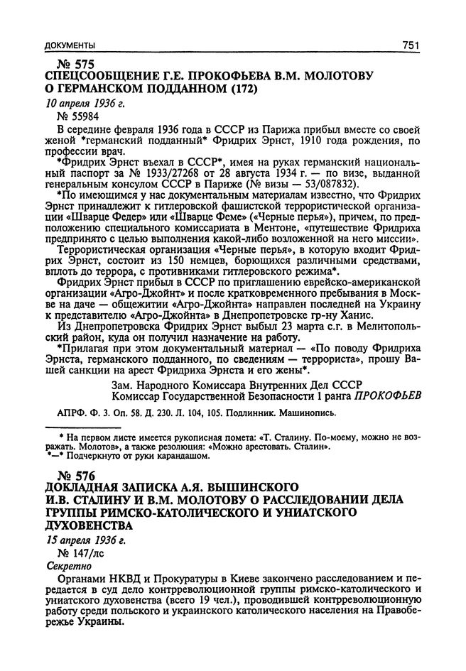 Докладная записка А.Я. Вышинского И.В. Сталину и В.М. Молотову о расследовании дела группы римско-католического и униатского духовенства. 15 Апреля 1936 г. // АПРФ. Ф. 3. Оп. 58. Д. 248. Л. 134, 135. Подлинник. Машинопись.