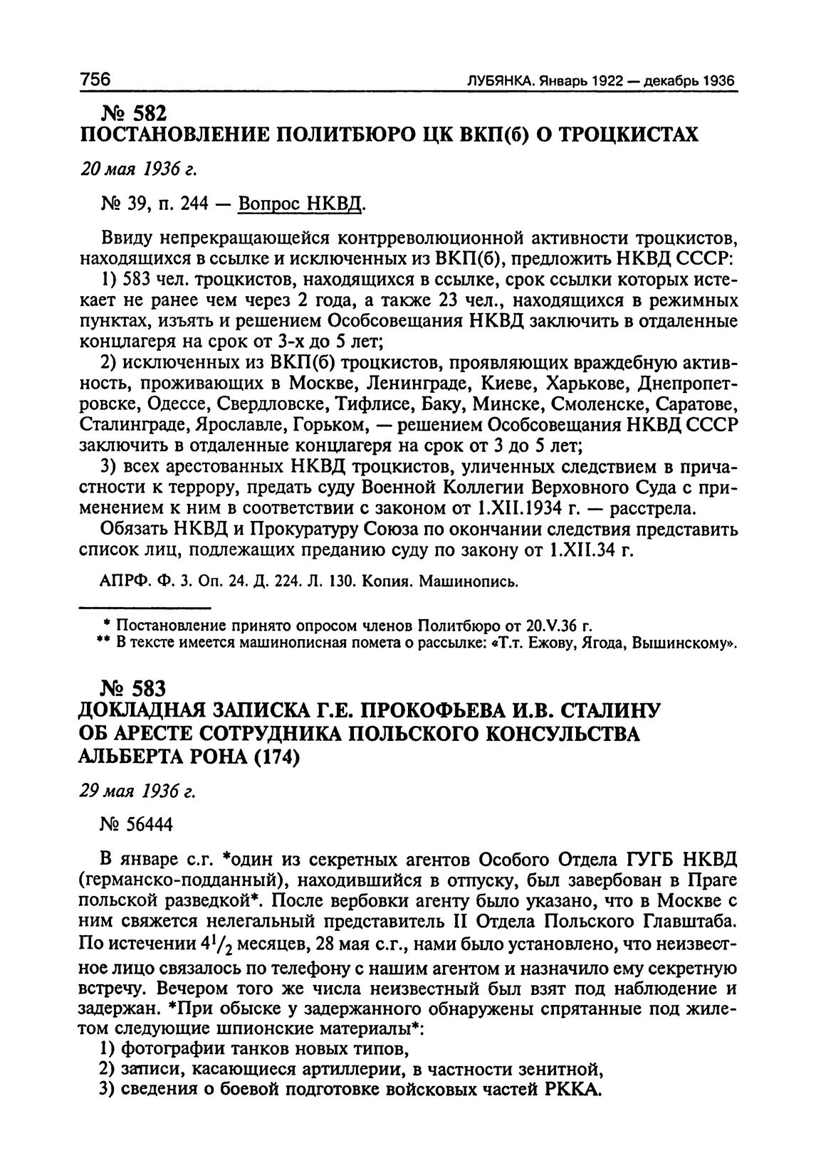 Лубянка. Сталин и ВЧК-ГПУ-ОГПУ-НКВД. Архив Сталина. Документы высших органов партийной и государственной власти. Январь 1922—декабрь 1936. — М.: МФД, 2003.