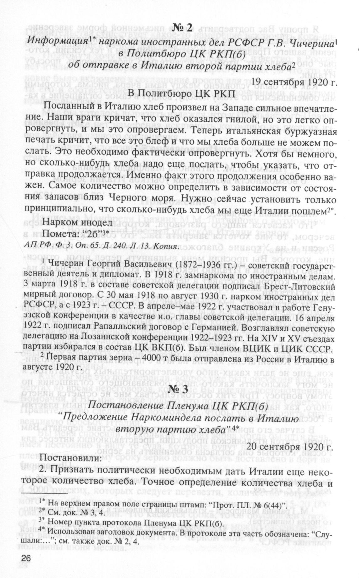 Информация наркома иностранных дел РСФСР Г.В. Чичерина в Политбюро ЦК РКП(б) об отправке в Италию второй партии хлеба. 20 сентября 1920 г. // АП РФ. Ф. 3. Oп. 65. Д. 240. Л. 13. Копия.