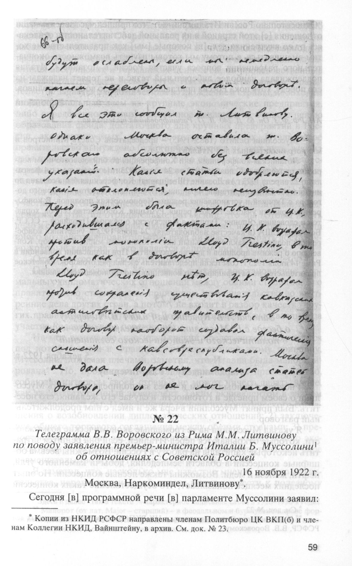 Телеграмма В.В. Воровского из Рима М.М. Литвинову по поводу заявления премьер-министра Италии Б. Муссолини об отношениях с Советской Россией. 16 ноября 1922 г. // АП РФ. Ф. 3. Oп. 65. Д. 240. Л. 77. Расшифрованная телеграмма.