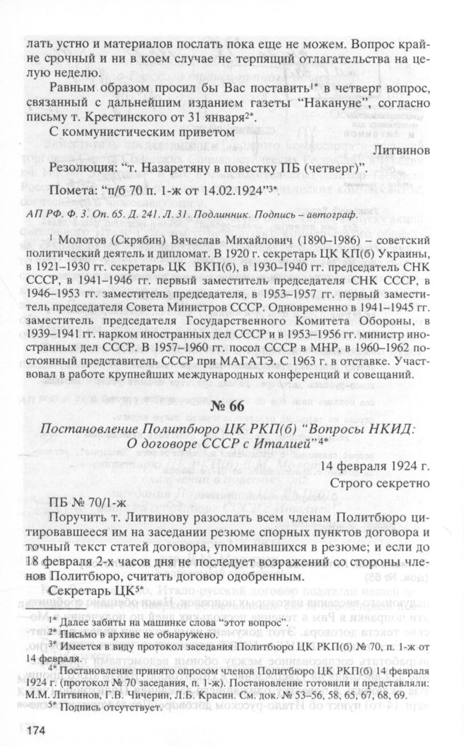 Постановление Политбюро ЦК РКП(б) “Вопросы НКИД: О договоре СССР с Италией”. 14 февраля 1924 г. // АП РФ. Ф. 3. Oп. 65. Д. 241. Л. 30. Выписка из протокола; Л. 33-35. Приложение. Копия.