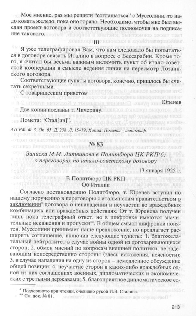 Записка М.М. Литвинова в Политбюро ЦК РКП(б) о переговорах по итало-советскому договору. 13 января 1925 г. // АП РФ. Ф. 3. Oп. 65. Д. 238. Л. 4-5. Подлинник. Пометы - автограф.