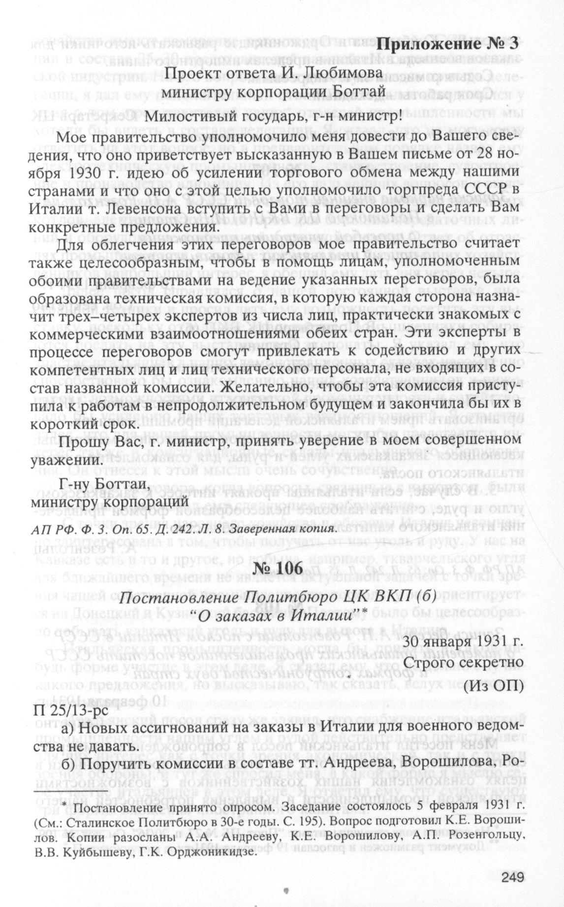 Постановление Политбюро ЦК ВКП(б) “О заказах в Италии”. 30 января 1931 г. // АП РФ. Ф. 3. Oп. 65. Д. 242. Л. 22. Выписка из протокола.
