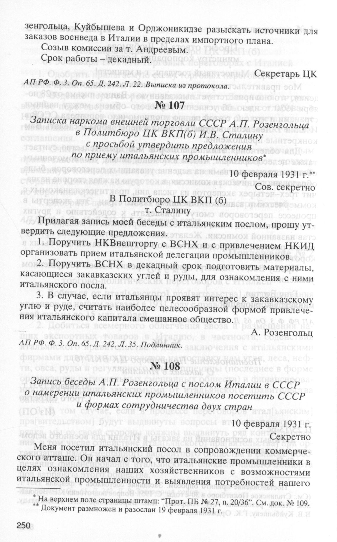 Запись беседы А.П. Розенгольца с послом Италии в СССР о намерении итальянских промышленников посетить СССР и формах сотрудничества двух стран. 10 февраля 1931 г. // АП РФ. Ф. 3. Оп. 65. Д. 242. Л. 36-37. Подлинник.