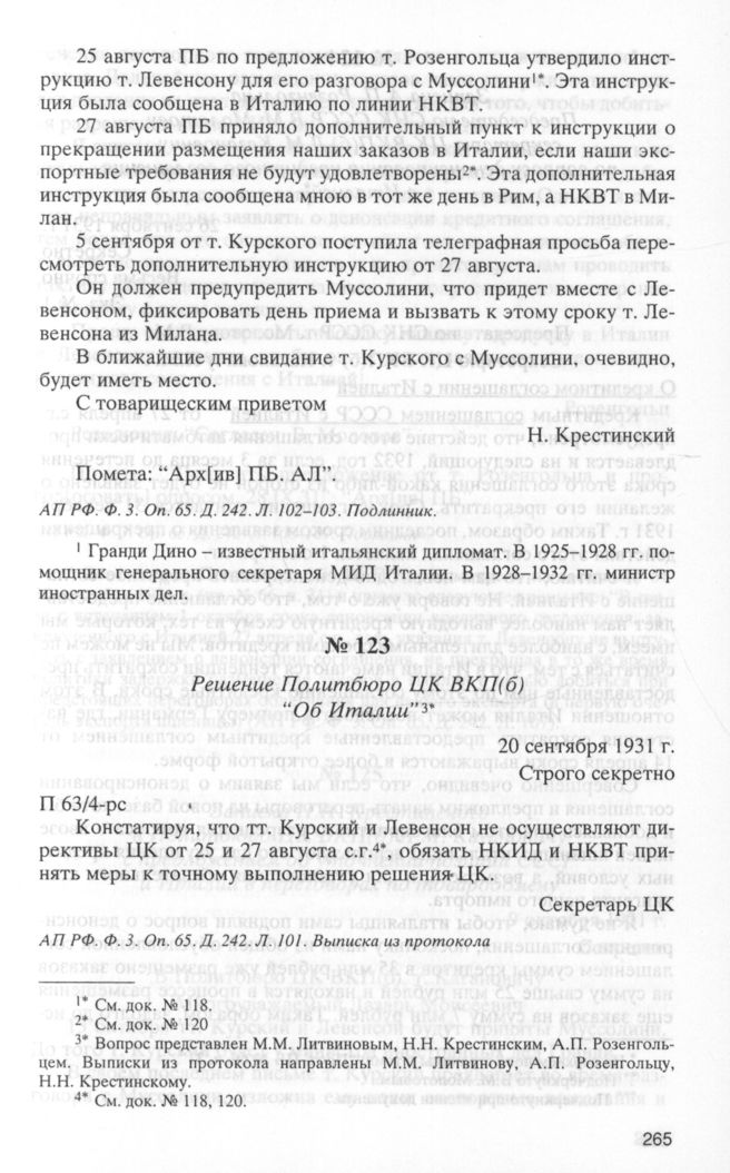 Решение Политбюро ЦК ВКП(б) “Об Италии”. 20 сентября 1931 г. // АП РФ. Ф. 3. Oп. 65. Д. 242. Л. 101. Выписка из протокола.