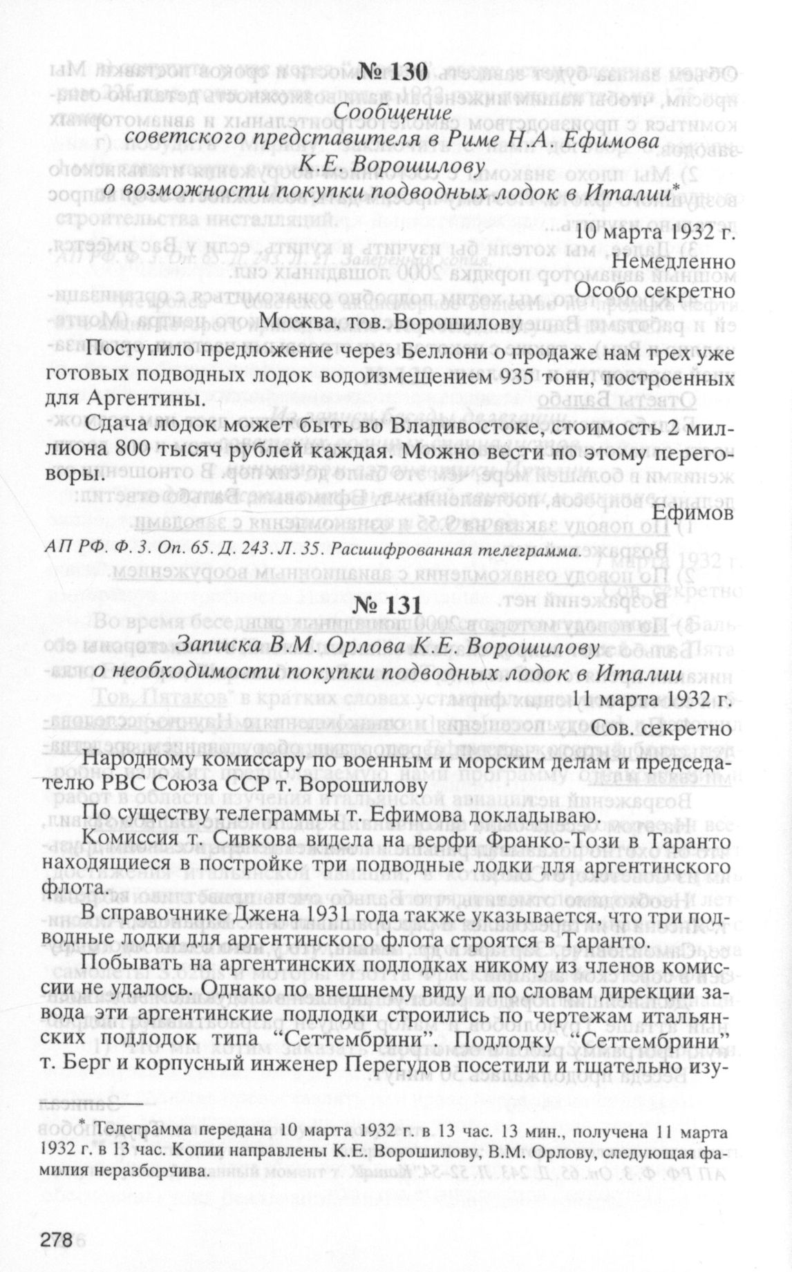 Записка В.М. Орлова К.Е. Ворошилову о необходимости покупки подводных лодок в Италии. 11 марта 1932 г. // АП РФ. Ф. 3. Oп. 65. Д. 243. Л. 36. Заверенная копия.