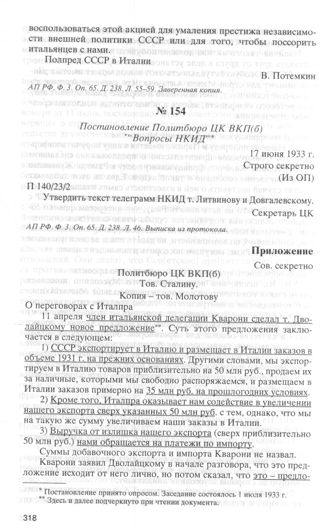 Постановление Политбюро ЦК ВКП(б) “Вопросы НКИД”. 17 июня 1933 г. // АП РФ. Ф. 3. Oп. 65. Д. 238. Л. 46. Выписка из протокола.