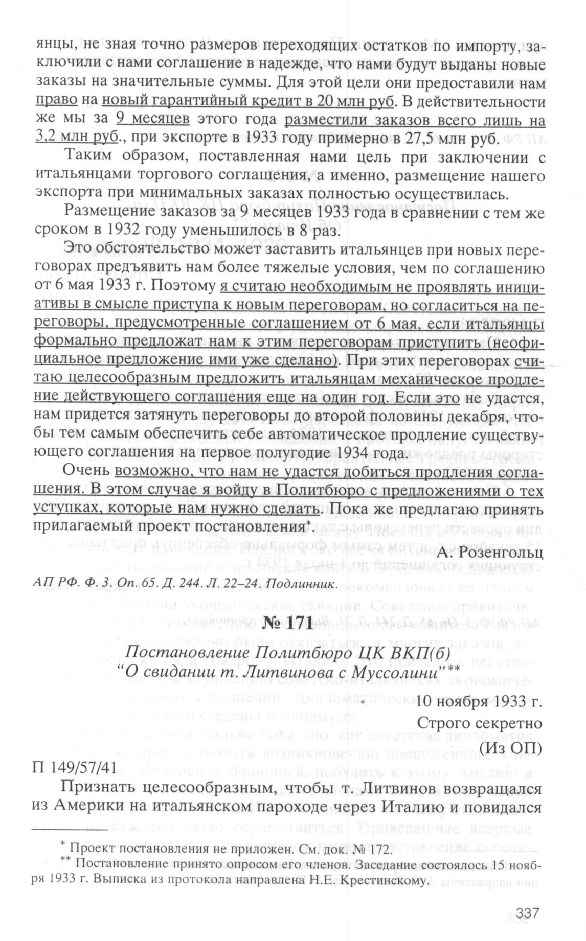 Постановление Политбюро ЦК ВКП(б) “О свидании Литвинова с Муссолини”. 10 ноября 1933 г. // АП РФ. Ф. 3. Oп. 65. Д. 244. Л. 26. Выписка из протокола.