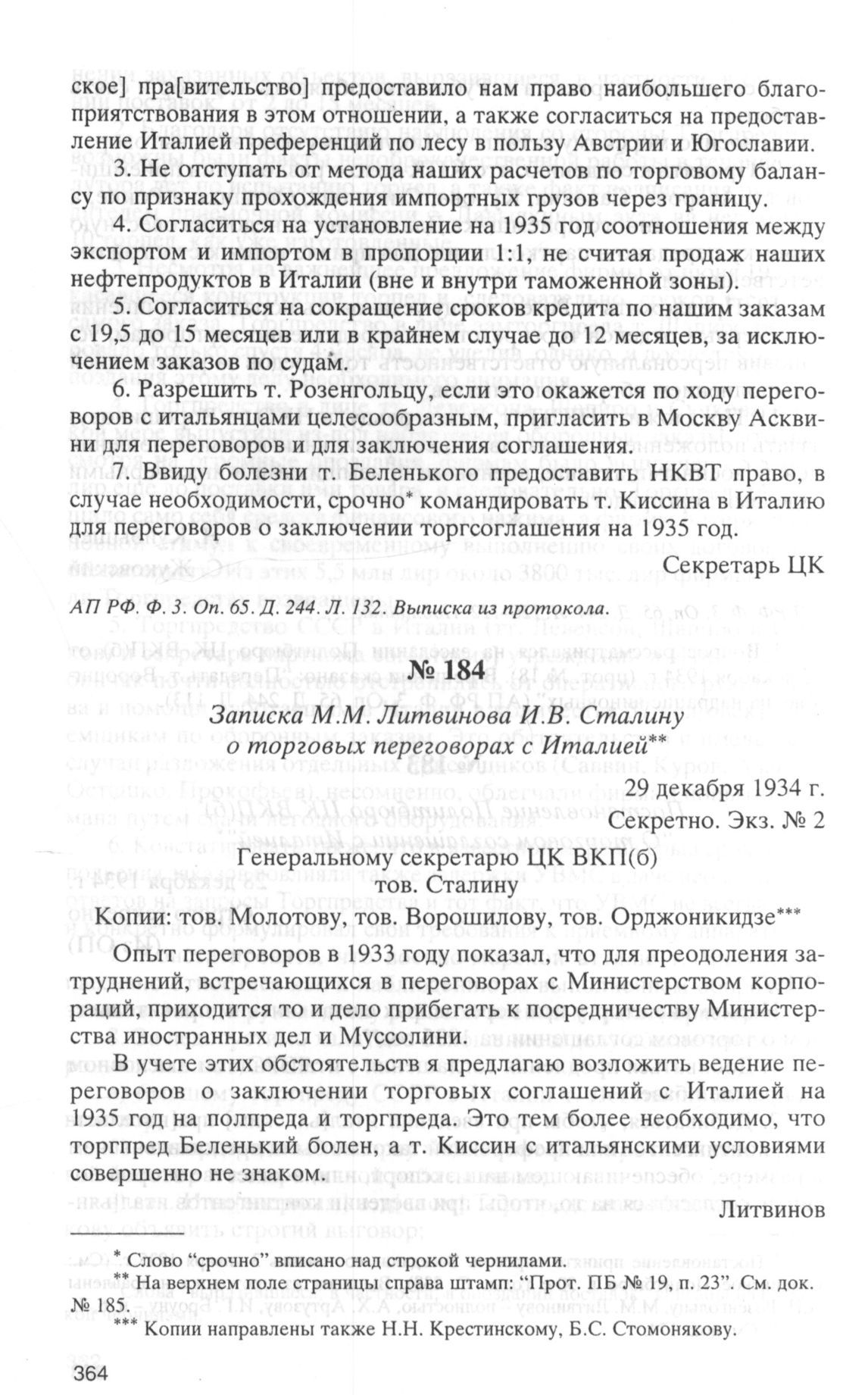 Записка М.М. Литвинова И.В. Сталину о торговых переговорах с Италией. 29 декабря 1934 г. // АП РФ. Ф. 3. Oп. 65. Д. 244. Л. 134. Копия.