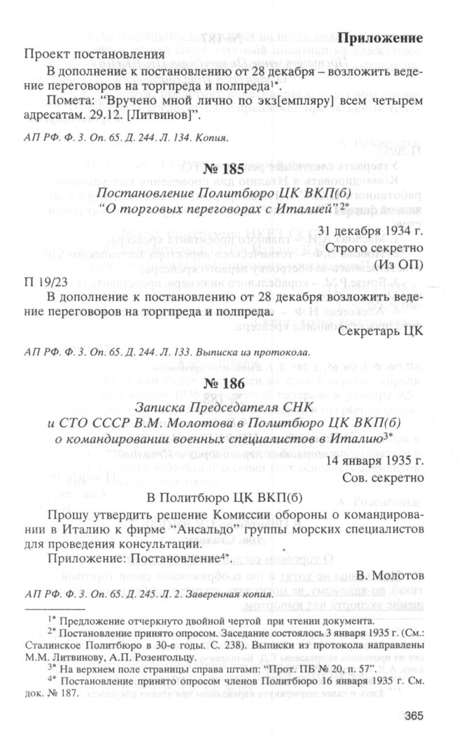 Записка Председателя СНК и СТО СССР В.М. Молотова в Политбюро ЦК ВКП(б) о командировании военных специалистов в Италию. 14 января 1935 г. // АП РФ. Ф. 3. Оп. 65. Д. 245. Л. 2. Заверенная копия.