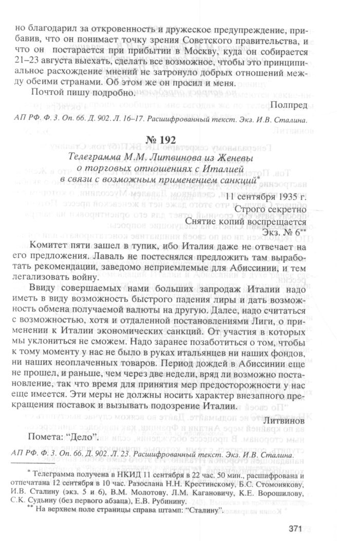 Телеграмма М.М. Литвинова из Женевы о торговых отношениях с Италией в связи с возможным применением санкций. 11 сентября 1935 г. // АП РФ. Ф. 3. Oп. 66. Д. 902. Л. 23. Расшифрованный текст. Экз. И В. Сталина.
