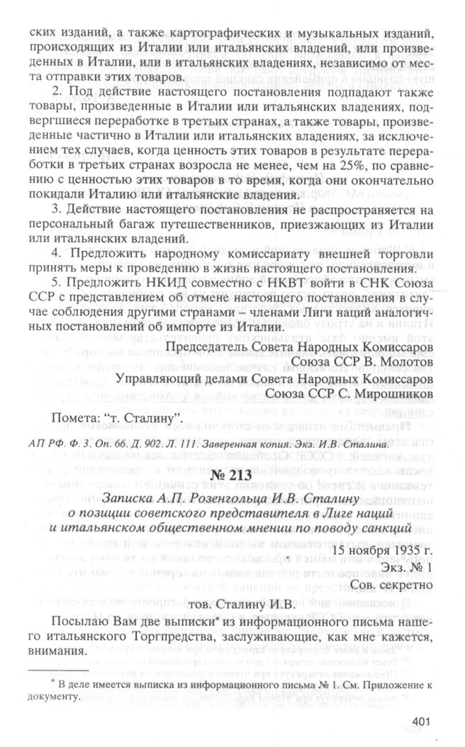 Записка А.П. Розенгольца И.В. Сталину о позиции советского представителя в Лиге наций и итальянском общественном мнении по поводу санкций. 15 ноября 1935 г. // АП РФ. Ф. 3. Oп. 66. Д. 902. Л. 115. Подлинник.