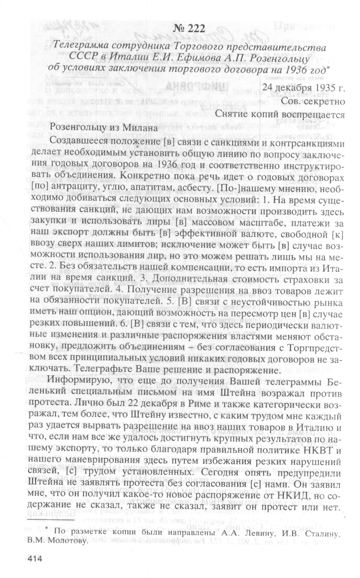 Телеграмма сотрудника Торгового представительства СССР в Италии Е.И. Ефимова А.П. Розенгольцу об условиях заключения торгового договора на 1936 г. 24 декабря 1935 г. // АП РФ. Ф. 3. Oп. 66. Д. 902. Л. 175-175об. Расшифрованный текст.