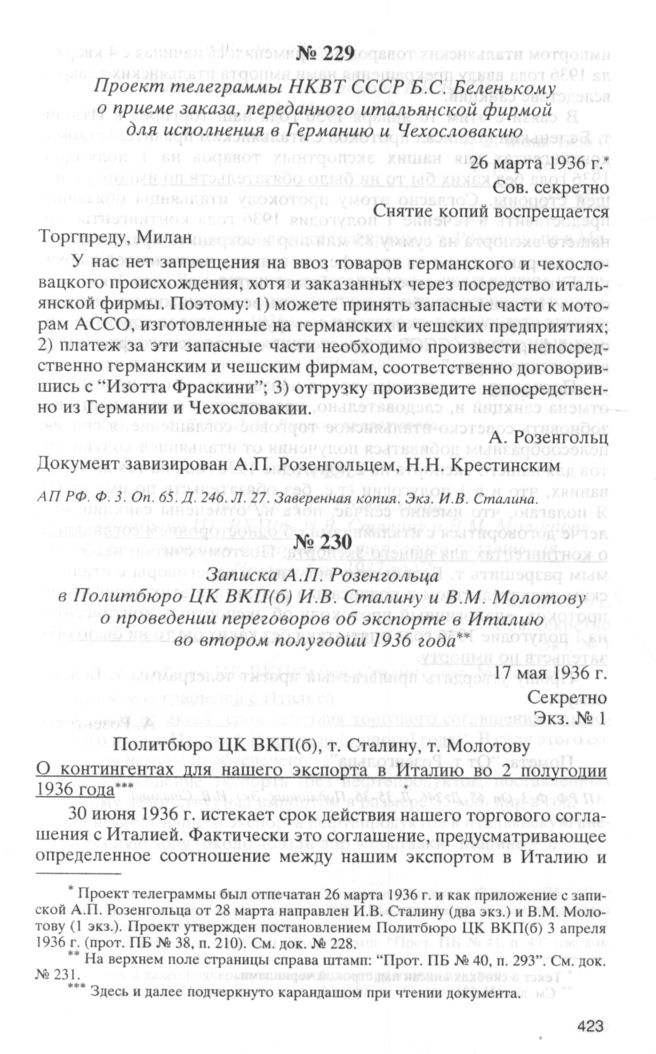 Записка А.П. Розенгольца в Политбюро ЦК ВКП(б) И.В. Сталину и В.М. Молотову о проведении переговоров об экспорте в Италию во втором полугодии 1936 года. 17 мая 1936 г. // АП РФ. Ф. 3. Oп. 65. Д. 246. Л. 35-36. Подлинник. Экз. И.В. Сталина.