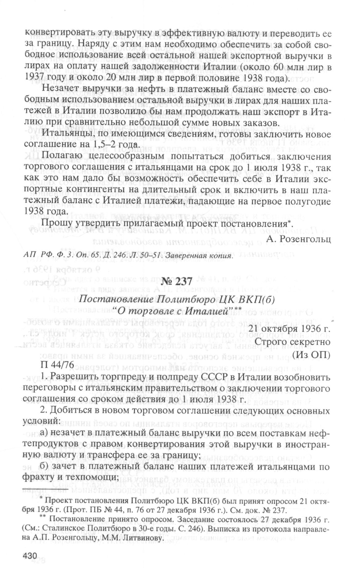 Постановление Политбюро ЦК ВКП(б) “О торговле с Италией. 21 октября 1936 г. // АП РФ. Ф. 3. Oп. 65. Д. 246. Л. 49. Выписка из протокола.