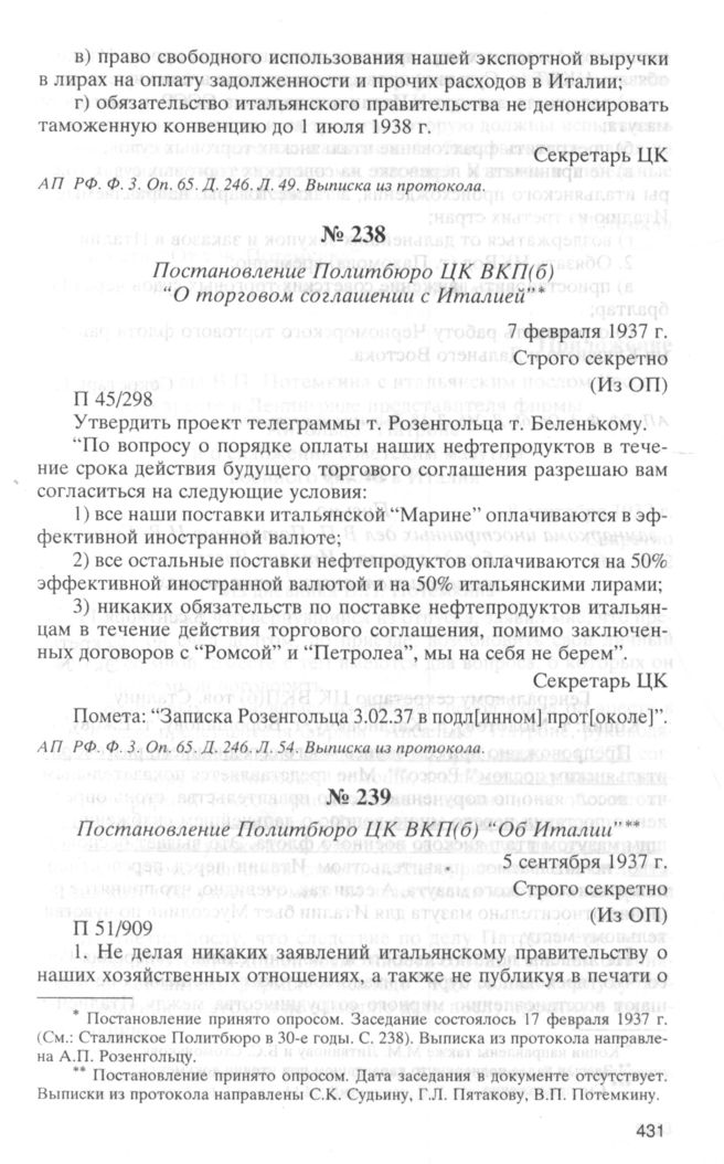 Постановление Политбюро ЦК ВКП(б) “Об Италии. 5 сентября 1937 г. // АП РФ. Ф. 3. Oп. 65. Д. 246. Л. 58. Выписка из протокола.