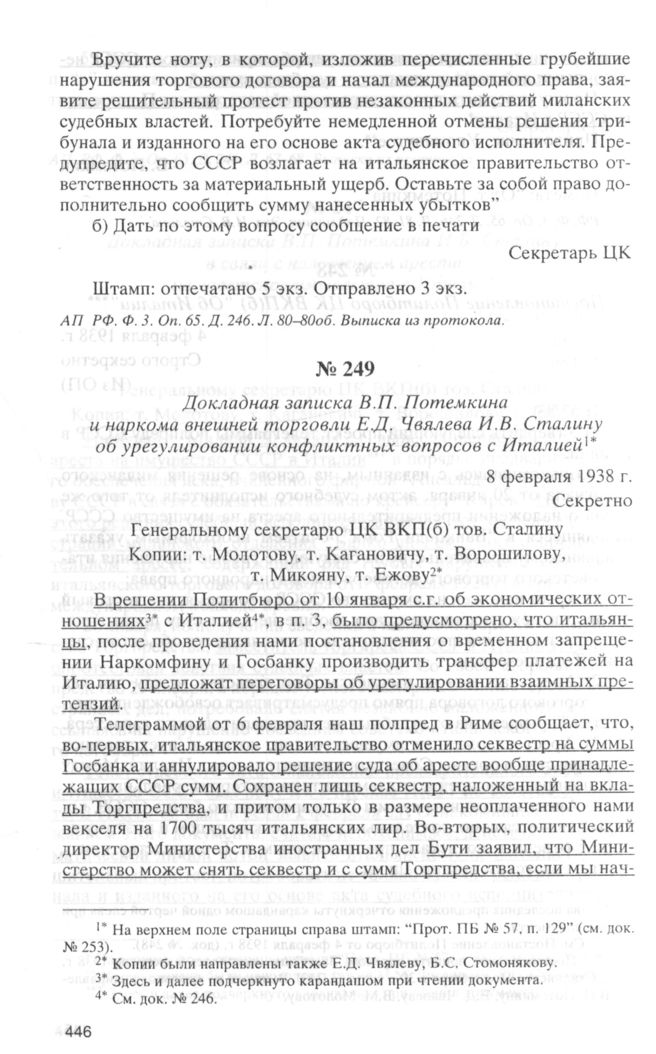 Докладная записка В.П. Потемкина и наркома внешней торговли Е.Д. Чвялева И.В. Сталину об урегулировании конфликтных вопросов с Италией. 8 февраля 1938 г. // АП РФ. Ф. 3. Oп. 65. Д. 246. Л. 102-103. Подлинник. Экз. И В. Сталина.