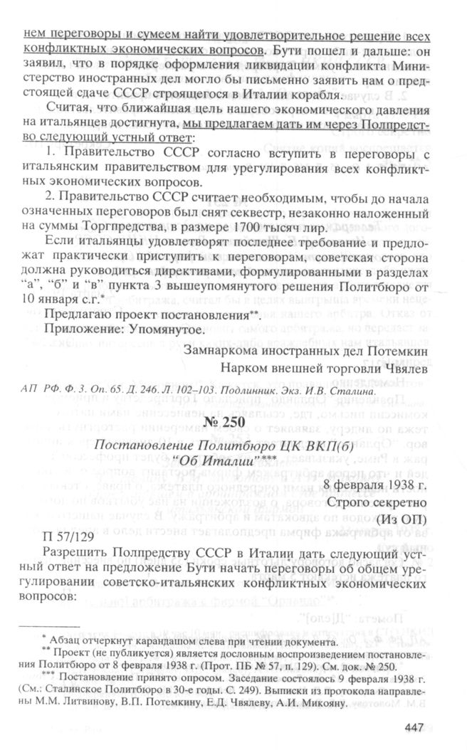 Постановление Политбюро ЦК ВКП(б) “Об Италии”. 8 февраля 1938 г. // АП РФ. Ф. 3. Oп. 65. Д. 246. Л. 101. Выписка из протокола.