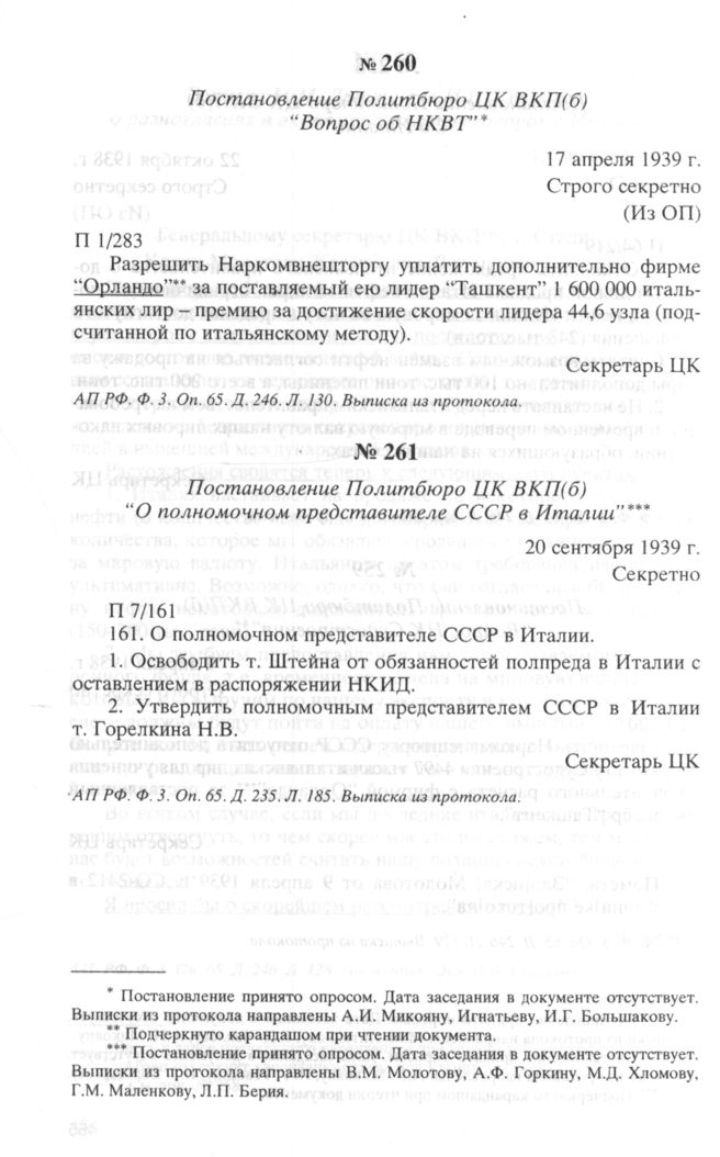 Постановление Политбюро ЦК ВКП(б) “Вопрос об НКВТ”. 17 апреля 1939 г. // АП РФ. Ф. 3. Oп. 65. Д. 246. Л. 130. Выписка из протокола.
