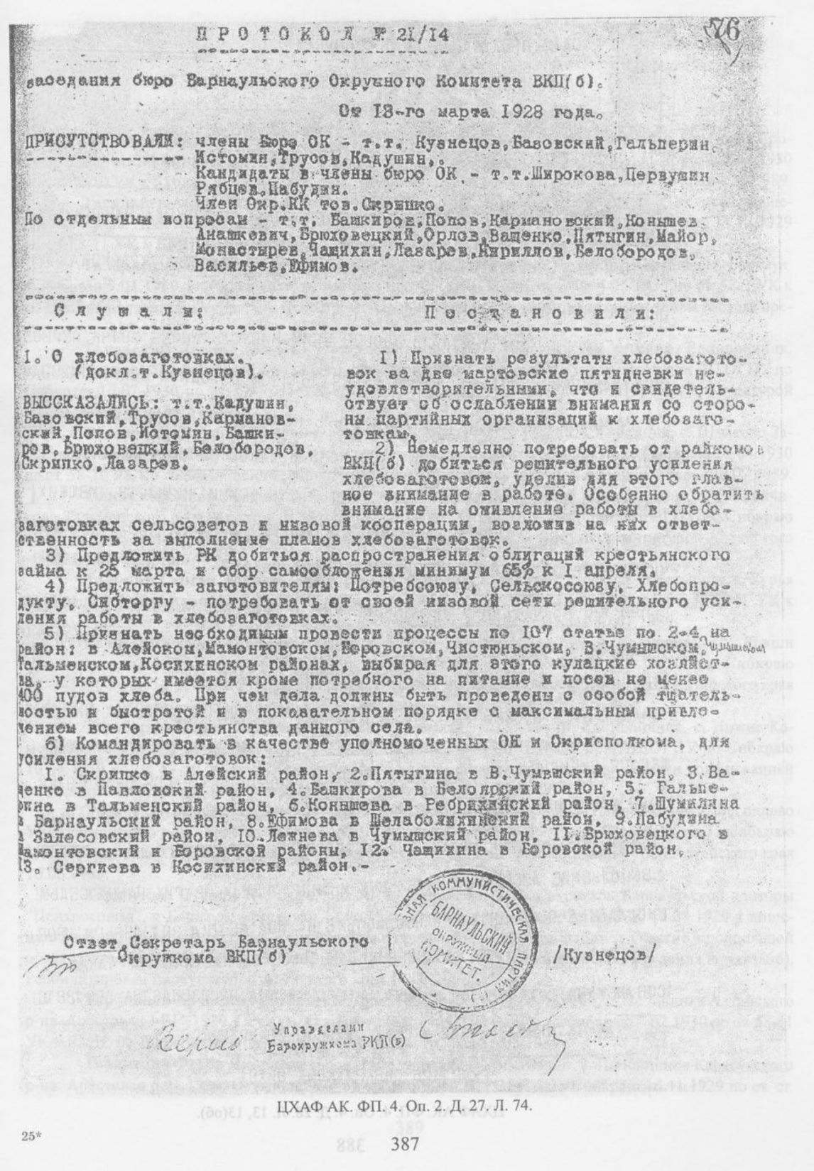 Протокол заседания бюро Барнаульского окружного комитета ВКП(б) о хлебозаготовках. 13 марта 1928 г. // ЦХАФ АК. ФП. 4. Оп. 2. Д. 27. Л. 74.