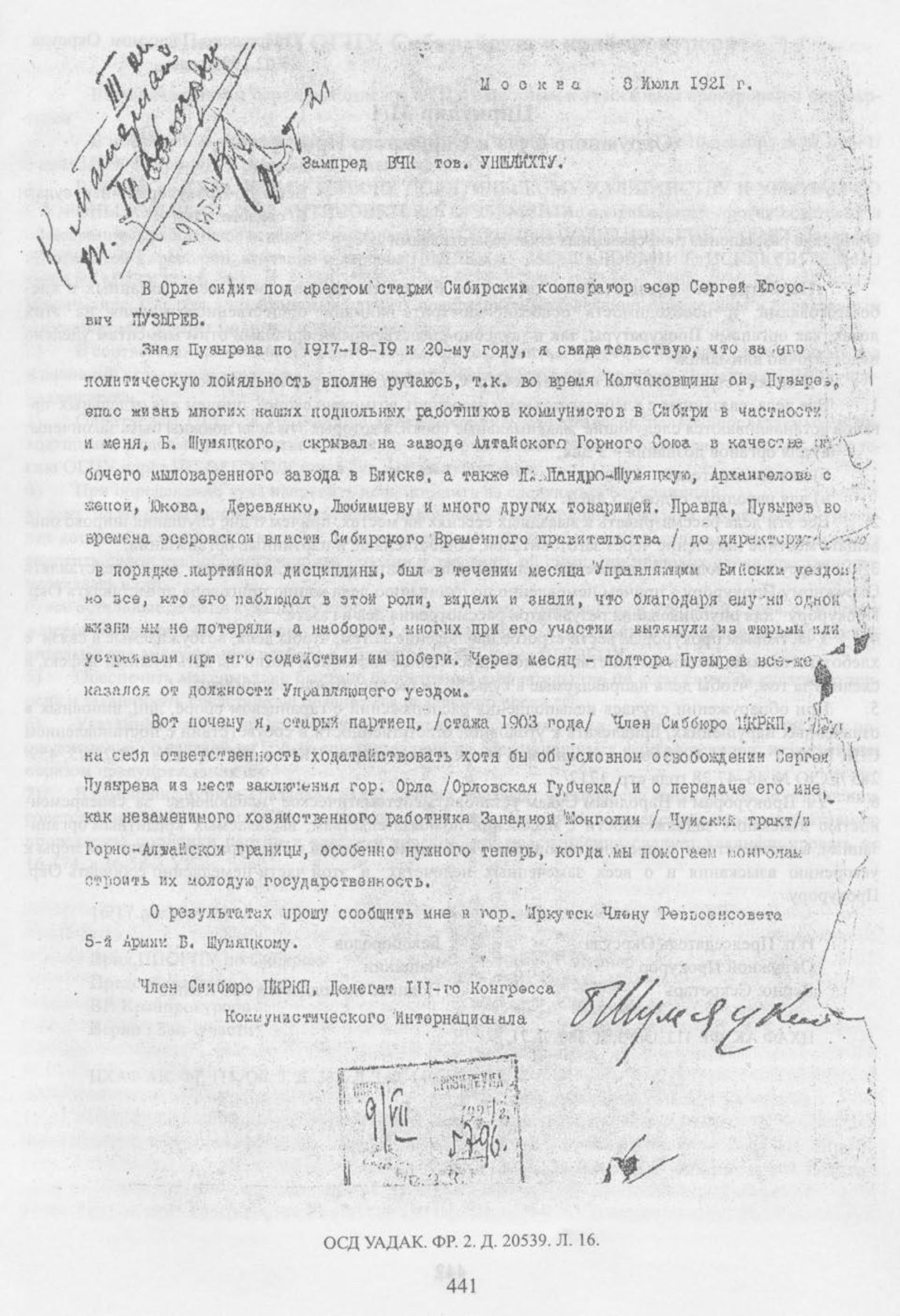 Письмо члена Сиббюро РКП(б), делегата III конгресса Коминтерна В. Шумяцкого зампреду ВЧК Уншлихту об освобождении эсера С.Е. Пузырева. 3 июля 1921 г. // ОСД УАДАК. ФР. 2. Д. 20539. Л. 16.