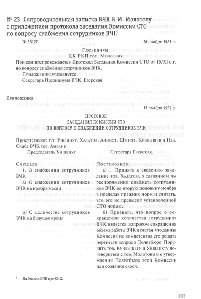 Сопроводительная записка ВЧК В.М. Молотову с приложением протокола заседания Комиссии СТО по вопросу снабжения сотрудников ВЧК. 16 ноября 1921 г. // АП РФ. Ф. 3. Oп. 58. Д. 52. Л. 15. Подлинник. Машинопись; Л. 16. Копия. Машинопись.