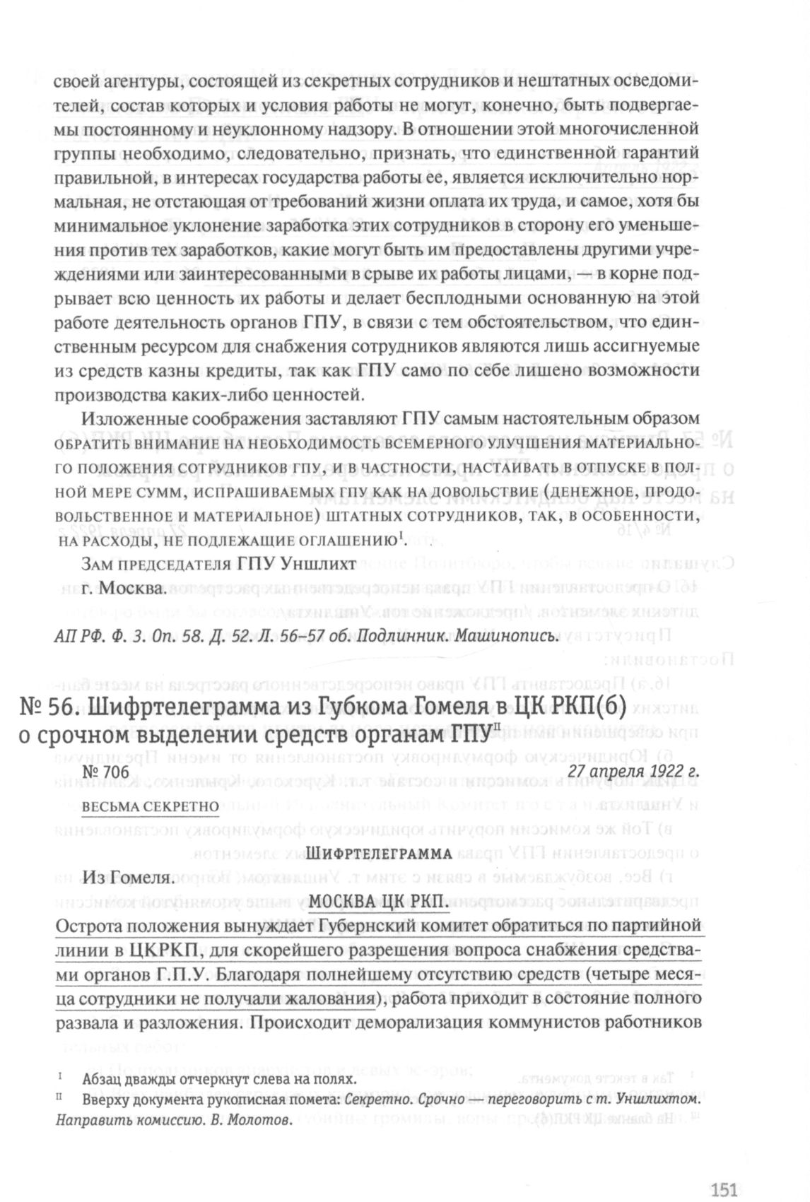 Шифртелеграмма из Губкома Гомеля в ЦК РКП(б) о срочном выделении средств органам ГПУ. 27 апреля 1922 г. // АП РФ. Ф. 3. Oп. 58. Д. 52. Л. 51. Копия. Машинопись.