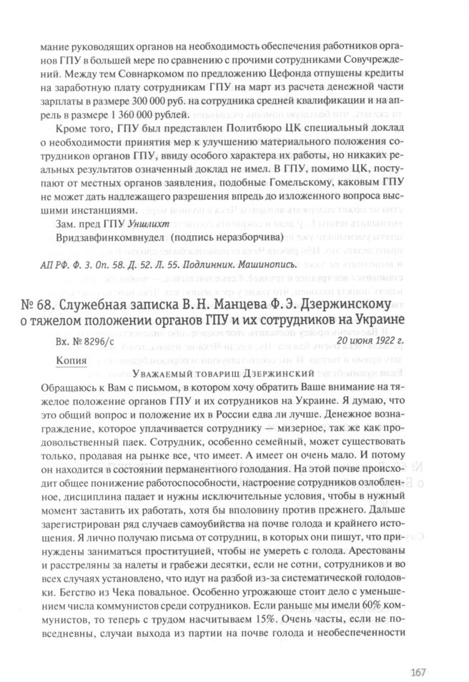 Служебная записка В.Н. Манцева Ф.Э. Дзержинскому о тяжелом положении органов ГПУ и их сотрудников на Украине. 20 июня 1922 г. // АП РФ. Ф. 3. Oп. 58. Д. 52. Л. 78-78 об. Копия. Машинопись.
