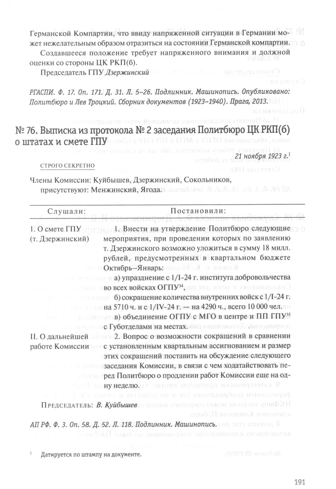 Выписка из протокола № 2 заседания Политбюро ЦК РКП(б) о штатах и смете ГПУ. 21 ноября 1923 г. // АП РФ. Ф. 3. Oп. 58. Д. 52. Л. 118. Подлинник. Машинопись.