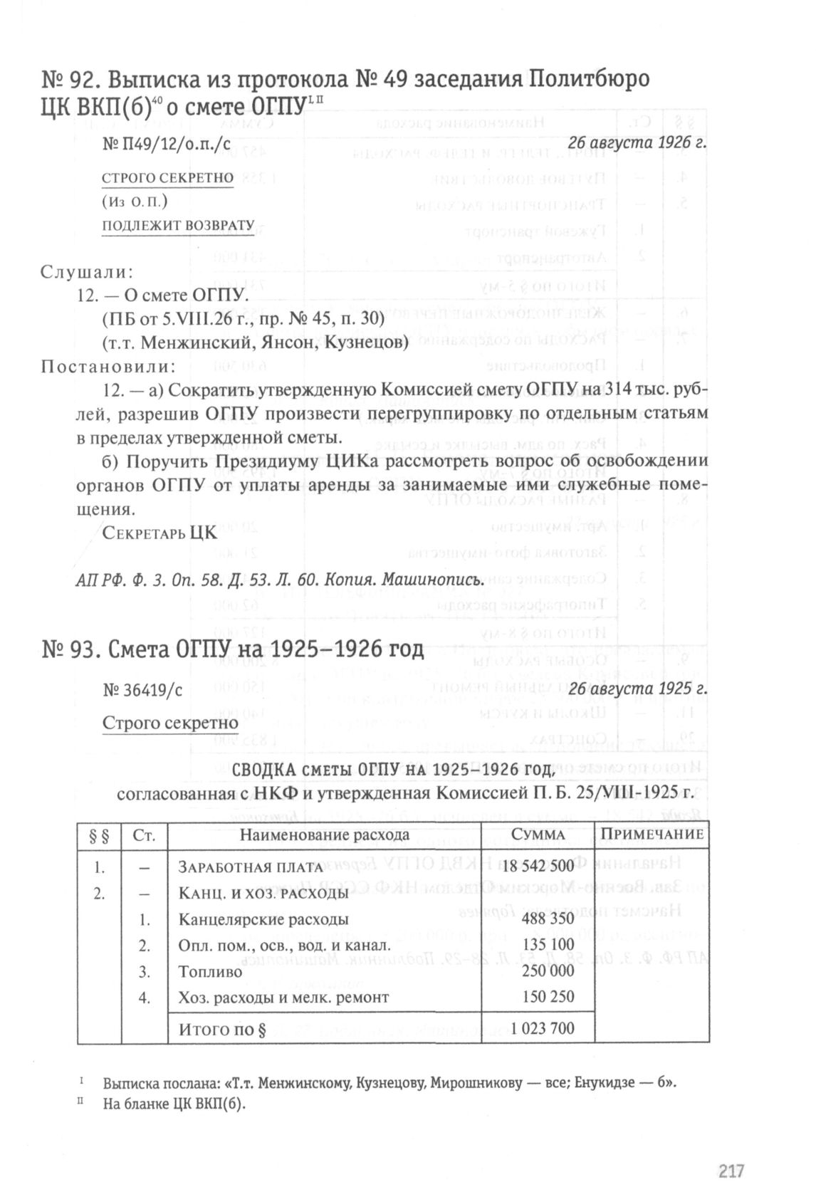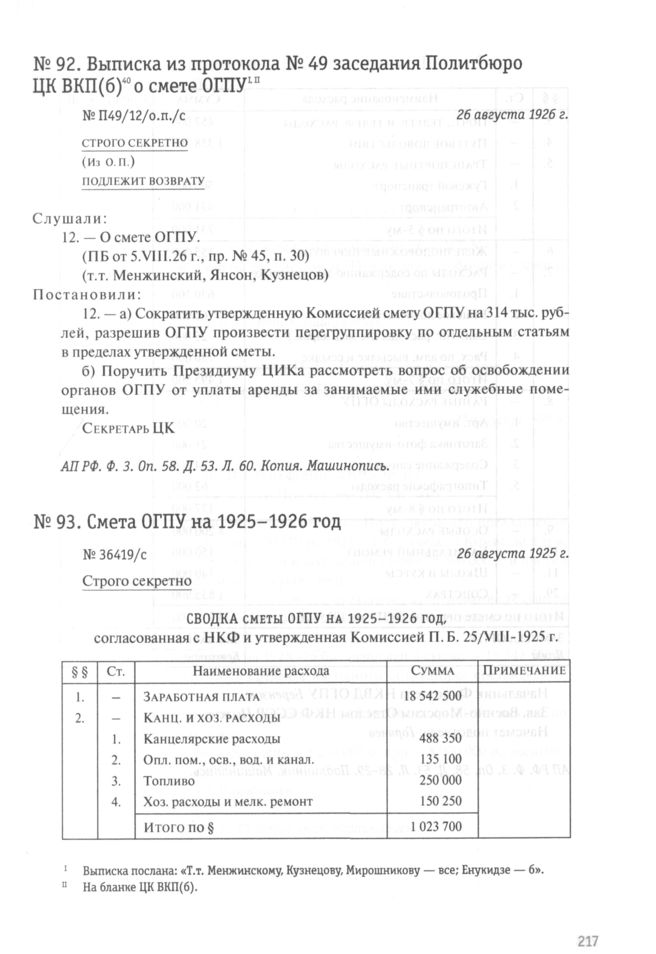 Смета ОГПУ на 1925-1926 год. 26 августа 1925 г. // АП РФ. Ф. 3. Oп. 58. Д. 53. Л. 28-29. Подлинник. Машинопись.