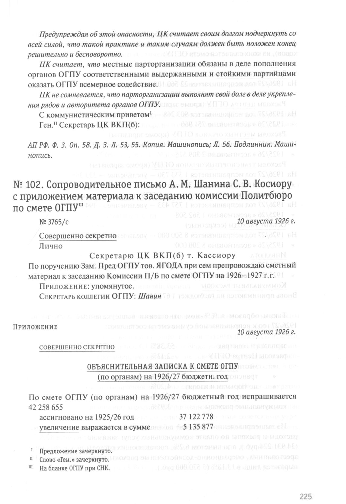 Сопроводительное письмо А.М. Шанина С.В. Косиору с приложением материала к заседанию комиссии Политбюро по смете ОГПУ. 10 августа 1926 г. // АП РФ. Ф. 3. Oп. 58. Д. 53. Л. 68-74. Подлинник. Машинопись.