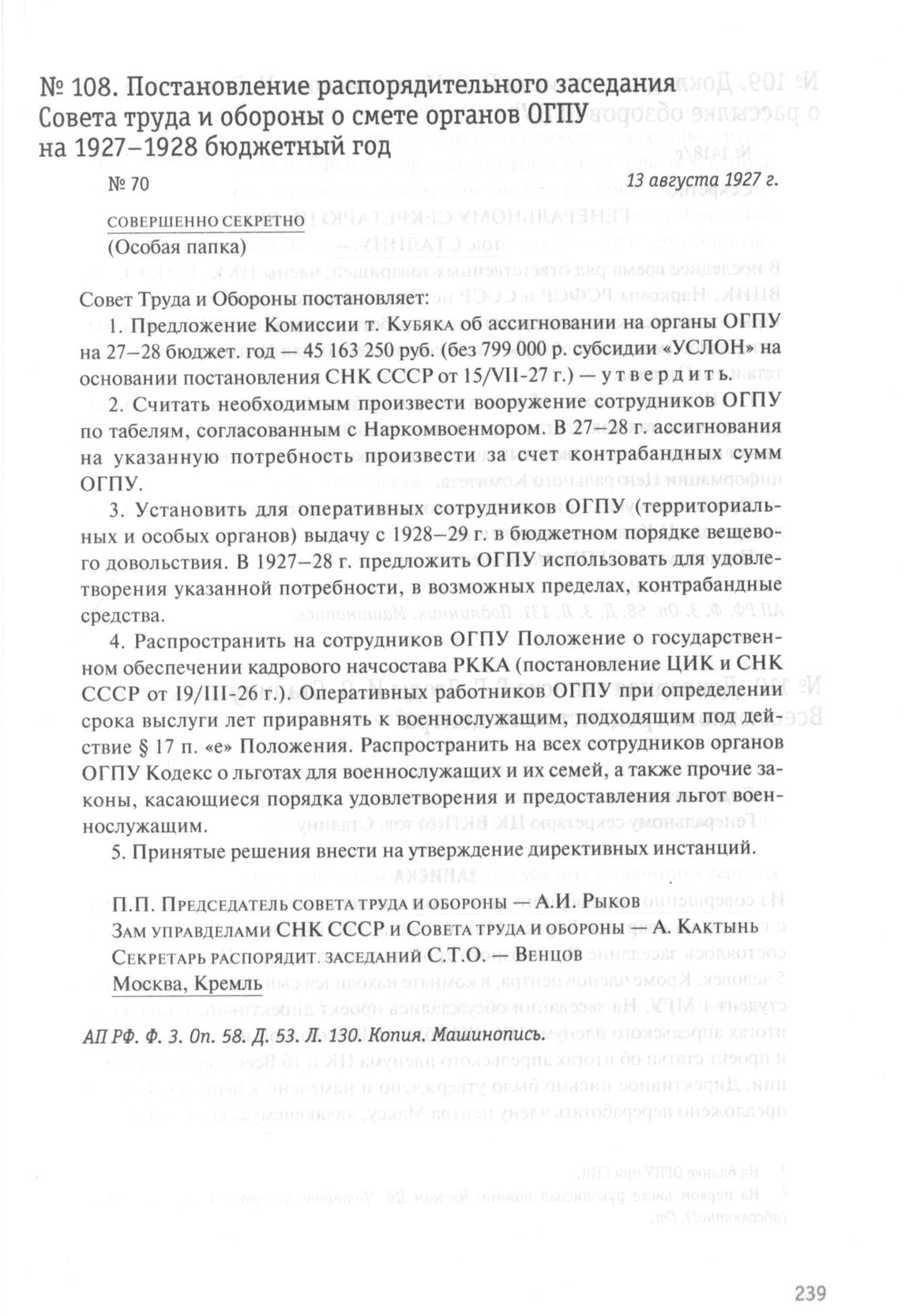 Постановление распорядительного заседания Совета труда и обороны о смете органов ОГПУ на 1927-1928 бюджетный год. 13 августа 1927 г. // АП РФ. Ф. 3. Oп. 58. Д. 53. Л. 130. Копия. Машинопись.