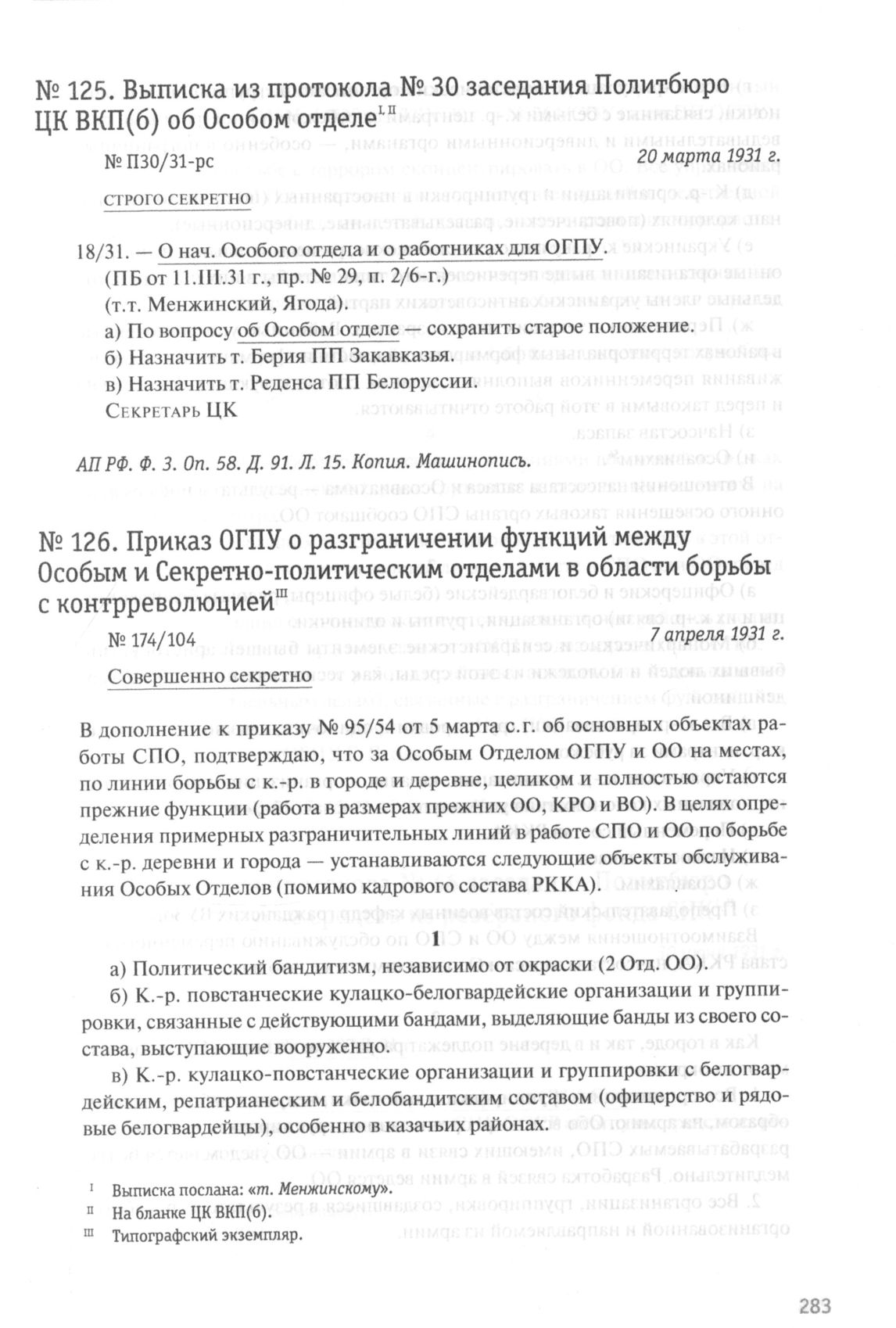 Приказ ОГПУ о разграничении функций между Особым и Секретно-политическим отделами в области борьбы с контрреволюцией. 7 апреля 1931 г. // АП РФ. Ф. 3. Oп. 58. Д. 91. Л. 16-16 об. Копия. Машинопись.