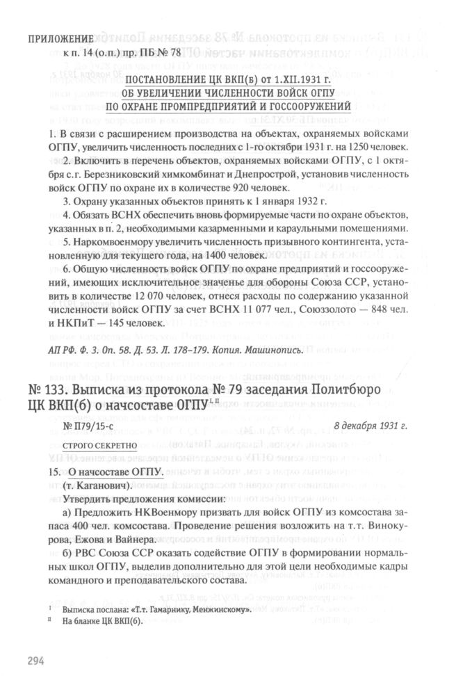 Выписка из протокола № 79 заседания Политбюро ЦК ВКП(б) о начсоставе ОГПУ. 8 декабря 1931 г. // АП РФ. Ф. 3. Oп. 58. Д. 53. Л. 180. Копия. Машинопись.